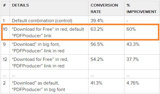 Example #10 outperformed the others by a large margin. It’s probably not a coincidence that it creates the most contrast out of all of the examples. You’ll notice that the PDFProducer text is small and light grey in colour, but the action text (“Download for Free”) is large and red, creating the contrast needed for high conversions. A final but critical consideration is how we define “success” for such tests. More sign-ups or more clicks is just a single measurement; often a misleading one that marketers try to game simply because it can be so easily measured.