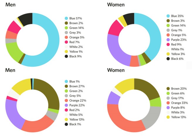 One of the more interesting examinations of this topic is Joe Hallock’s work on “Colour Assignment.” Hallock’s data showcases some clear preferences in certain colours across gender (most of his respondents were from Western societies). The most notable points in his images are the supremacy of blue across both genders and the disparity between groups on purple.