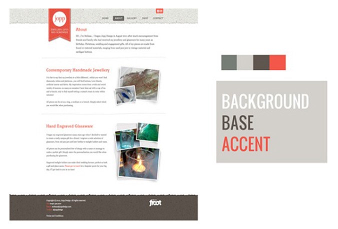 Another way to think of this is to utilize background, base, and accent colours, as designer Josh Byers showcases below, to create a hierarchy on your site that “coaches” customers on which colour encourages action.